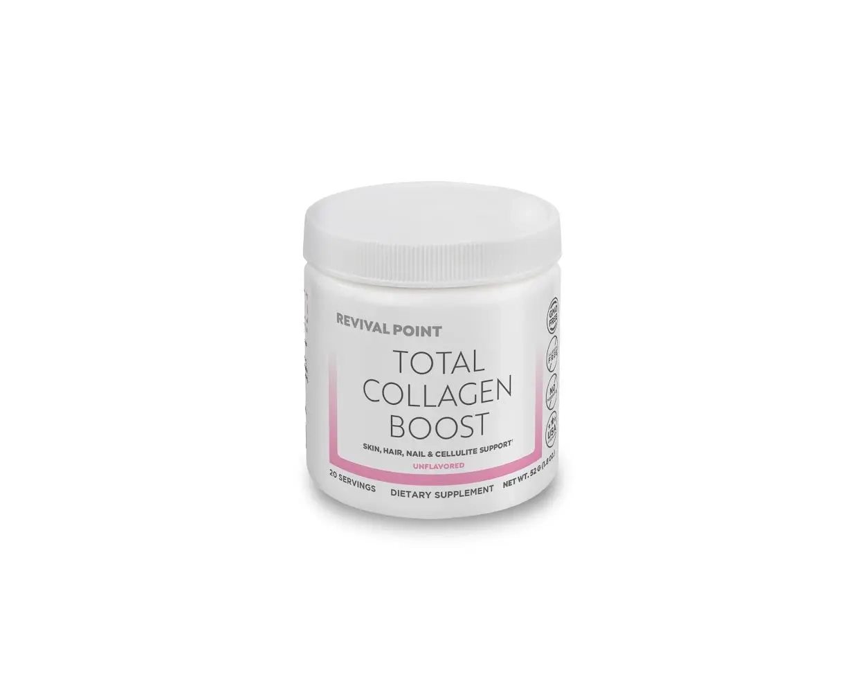 Total Collagen Boost by Revival Point is a doctor-backed, award-winning German formula designed to reduce wrinkles and lift saggy skin. It targets the root of skin ageing by reactivating sleeping fibroblast cells, which improves collagen production and restores firmness and elasticity.